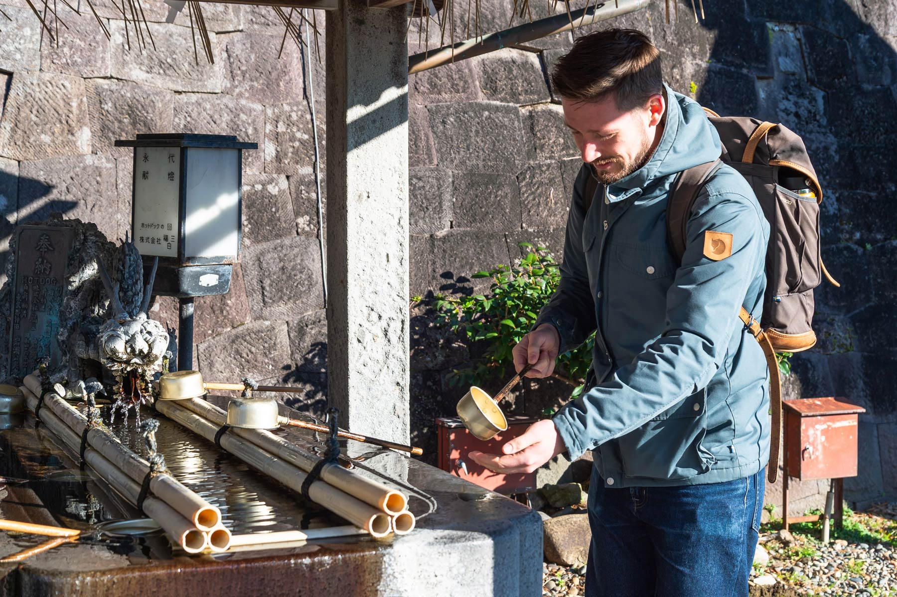 Nach dem Betreten der Tempelanlage – bzw. eigentlich noch vor dem eigentlichen Tempel – reinigt man sich in der Regel am chozuya, dem Wasserbecken nahe dem Eingang. Dabei werden Hände und Mund mit den bereitgestellten Schöpfkellen gespült. Das Ganze dient der symbolischen Reinigung von Körper und Geist, bevor man den Tempel betritt. Das Wasser zu trinken ist kein Muss, was ich aus hygienischer Sicht auch nicht mache, auch wenn man sieht, dass manche Leute es trotzdem tun.